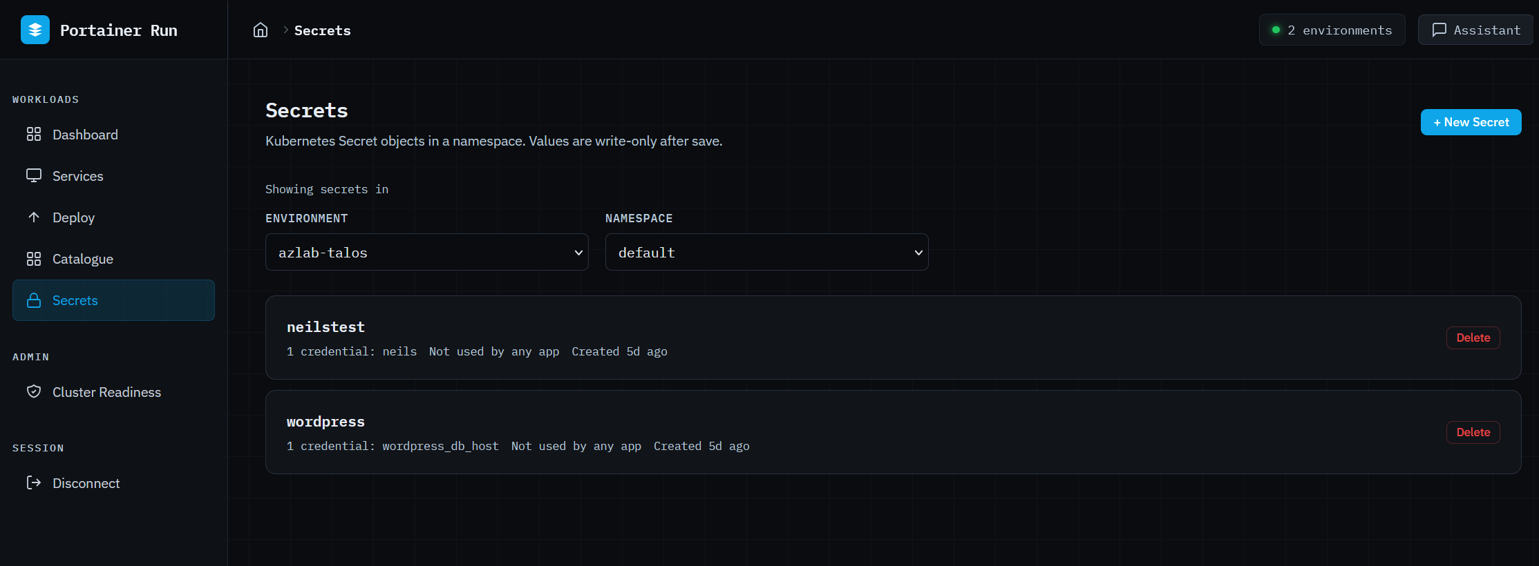 Secrets gives namespace-scoped access to Kubernetes Secrets without exposing the underlying cluster. Create with multiple key/value pairs (values are write-only and never displayed after saving), delete with confirmation, and see which apps reference each secret at a glance. Secrets created outside Portainer Run are fully referenceable, because that’s a normal operational requirement.
