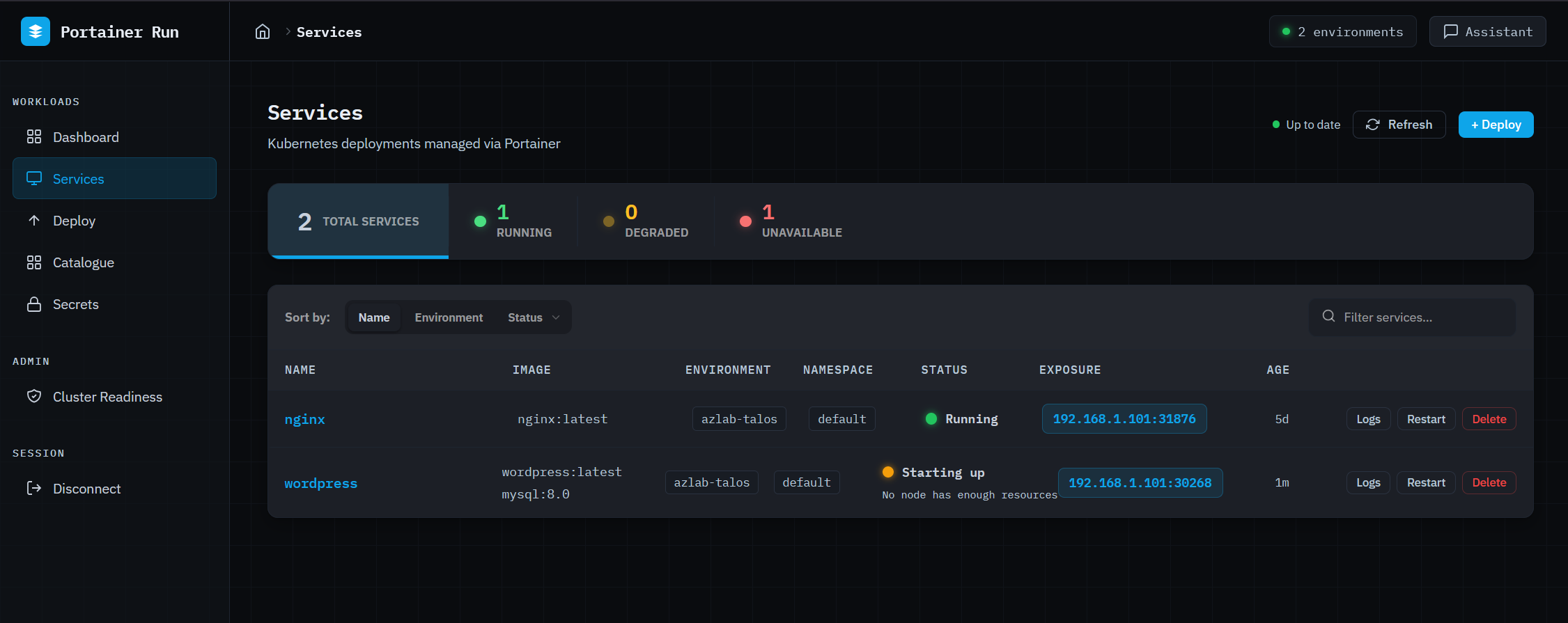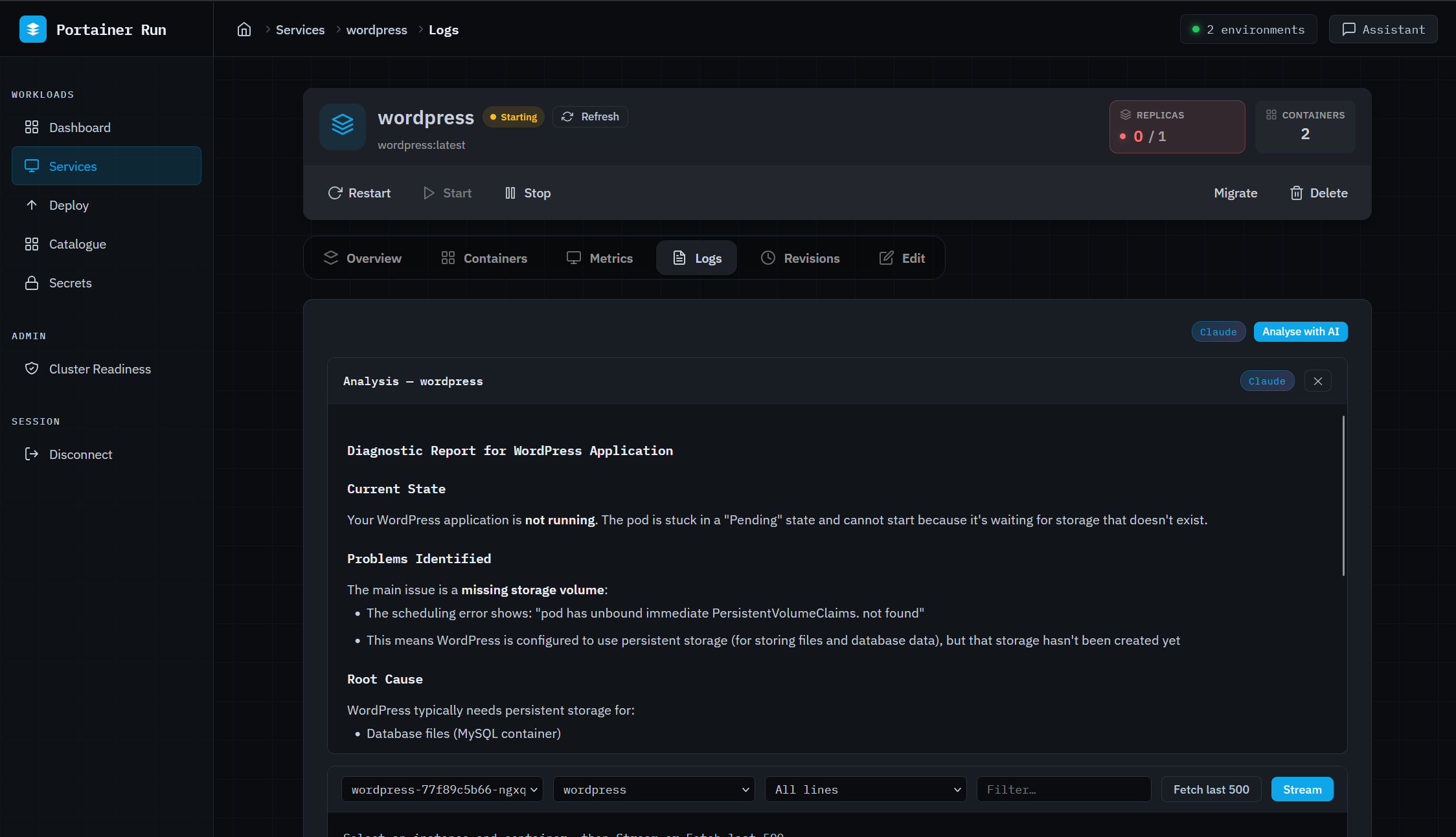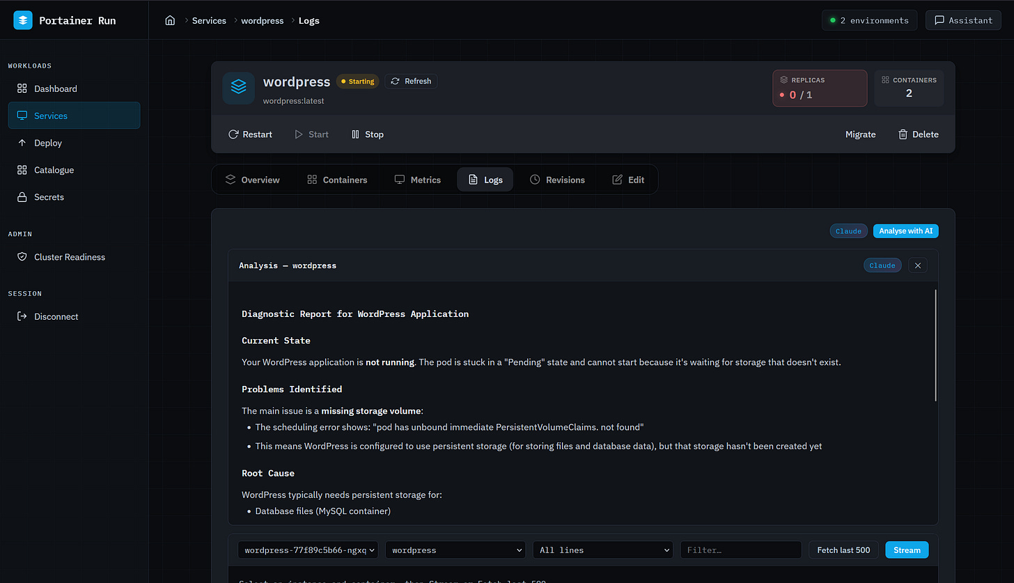The Assistant is where the AI actually earns its place in this interface. It’s a persistent chat panel available on every page, context-aware of whatever you’re looking at (current page, open service, environment). When a business developer asks “why isn’t my app connecting to the database,” the Assistant proactively fetches logs, pod conditions, and Kubernetes events before generating a response. It doesn’t ask you to check them yourself. It covers failure modes where no logs exist yet (scheduling failures, image pull errors, resource constraints) because it reads from events rather than relying on application output. It can translate a Docker Compose file into a Portainer Run deployment, describe a workload in natural language to pre-populate the deploy form, and detect scale requests to open the Edit tab pre-filled. It never executes irreversible operations directly... those route to the existing UI.