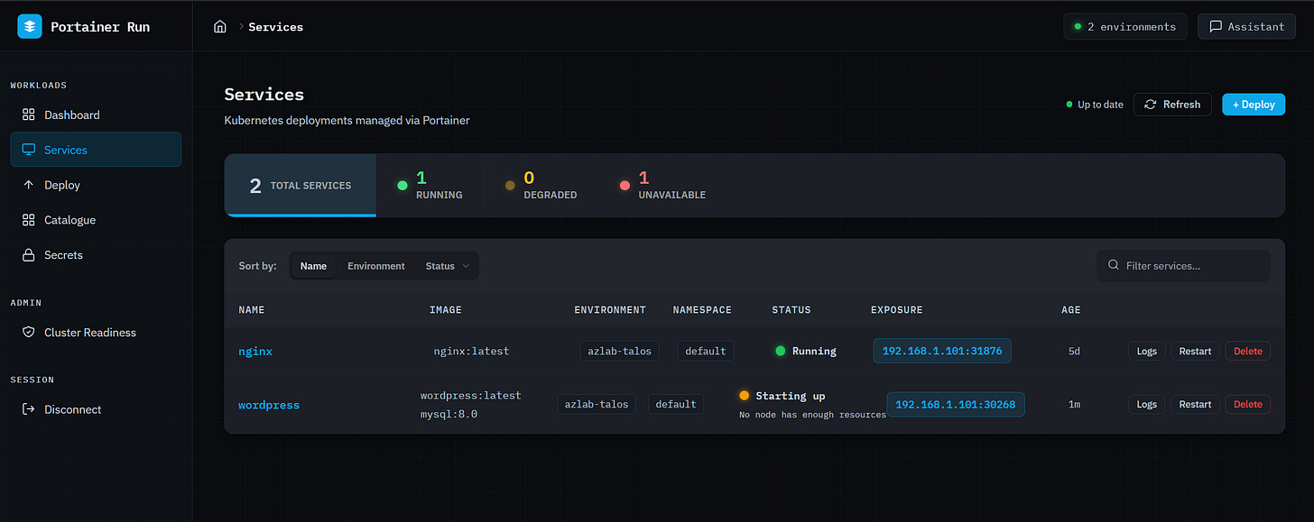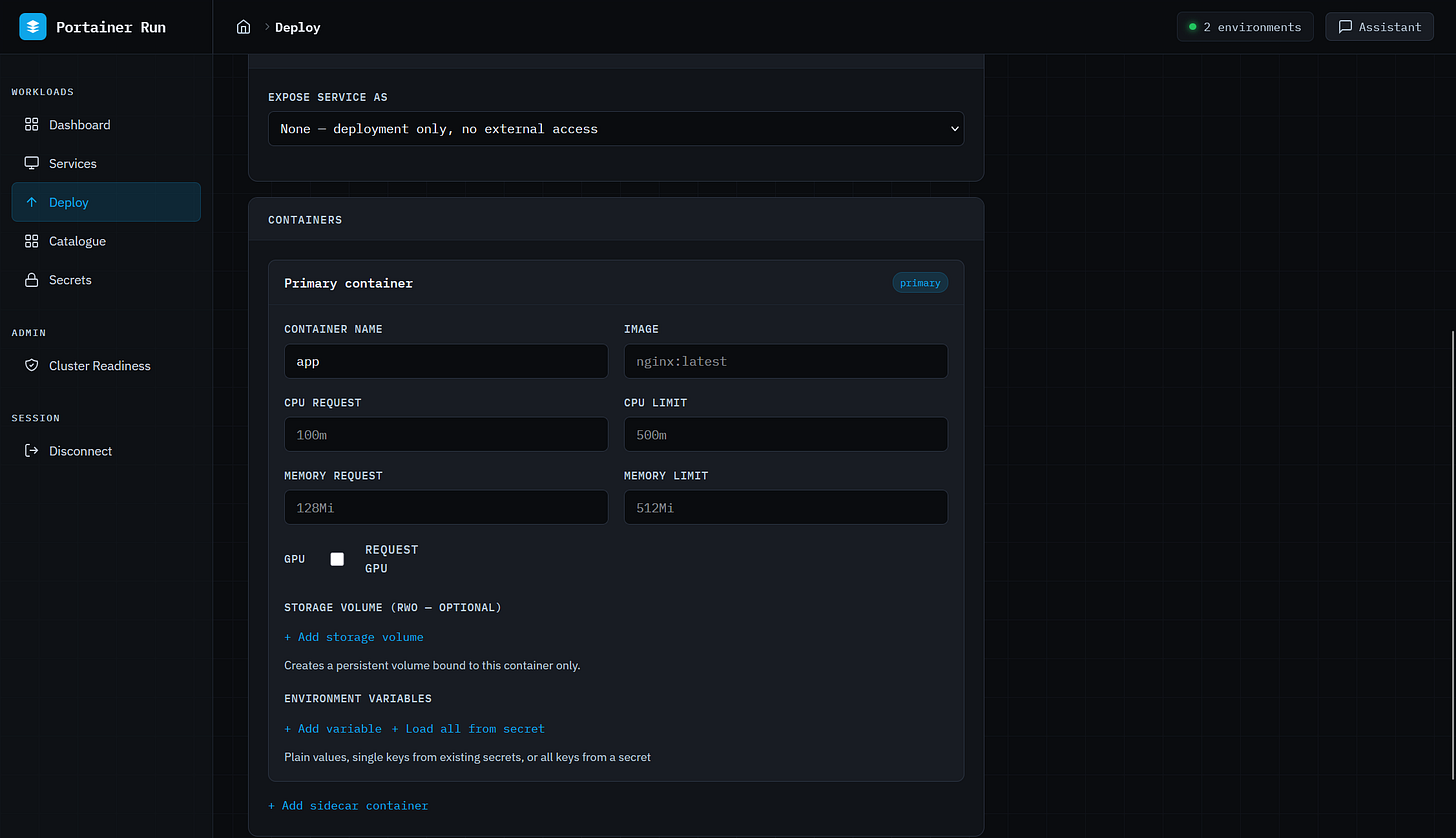 The interface is deliberately narrow in scope. It doesn’t replace Portainer. It surfaces one workflow (deploy, run, and operate a containerized workload) in the simplest interface we could build for it, for people who have no idea what a Pod is and shouldn’t need to.