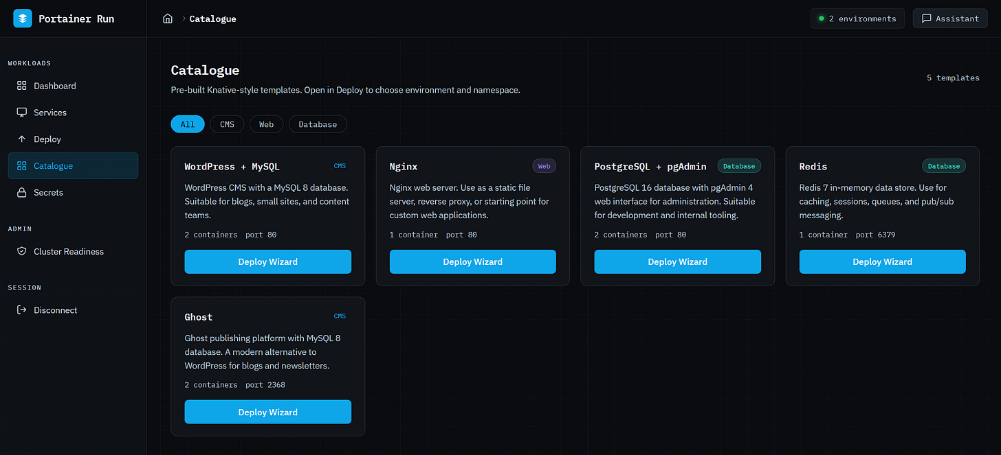 The Catalogue is a curated library of pre-configured application stacks. A two-step wizard selects the target environment and namespace, shows a confirmation summary, and fires the full deployment sequence in two clicks. Templates are fetched from a configurable URL (default uses one Portainer hosts, but you can use one you create and host) and cached server-side, the format is Knative Service manifest, and nothing is locked to a proprietary schema. The citizen developer who just wants to get something running finds what they need here.
