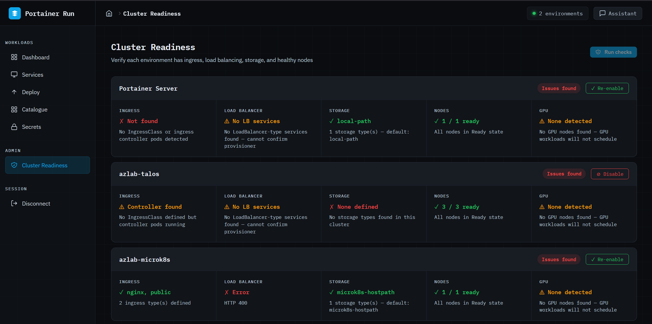 Cluster Readiness (admin only) checks each connected environment for ingress controller availability, LoadBalancer provisioning, storage class configuration, node health, and GPU node availability, and reports each result in plain English. Admins can disable environments from this view; disabled environments are hidden from all dropdowns and views for non-admin users and blocked from receiving new deployments for everyone. That’s the platform team’s control surface: decide which clusters are ready, and the guardrails apply everywhere automatically.