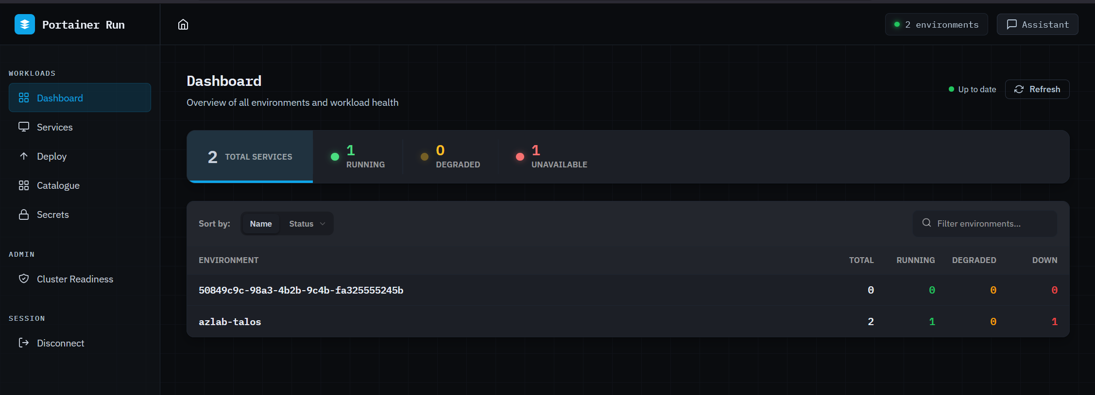 The dashboard gives you a live health summary across all connected environments at a glance: total services, running, degraded, and unavailable, broken down per environment. On reconnect, the last known state is shown immediately while live data loads in the background, so the first thing you see is never a loading spinner.