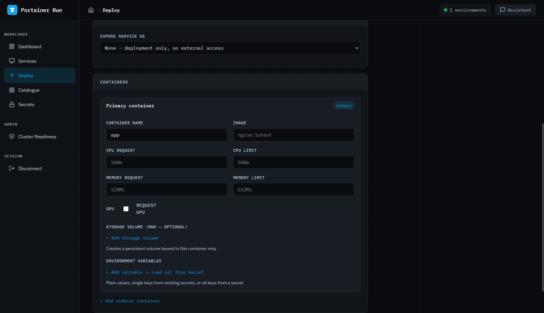 Deploy is a Cloud Run-style form that covers single and multi-container workloads, persistent storage, environment variables, Kubernetes Secrets references, resource limits including GPU, and service exposure. No YAML, no kubectl. The same open standard underpinning Google Cloud Run, surfaced as a form a business developer can actually use. GPU support auto-detects the resource type available on the target environment’s nodes (NVIDIA, AMD, Intel, Habana) and sets the correct resource key automatically, which matters as GPU workloads stop being exclusively the province of ML engineers.